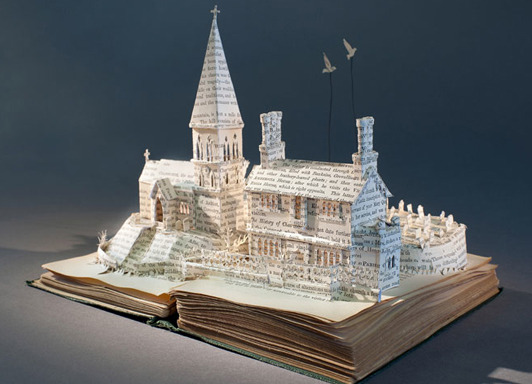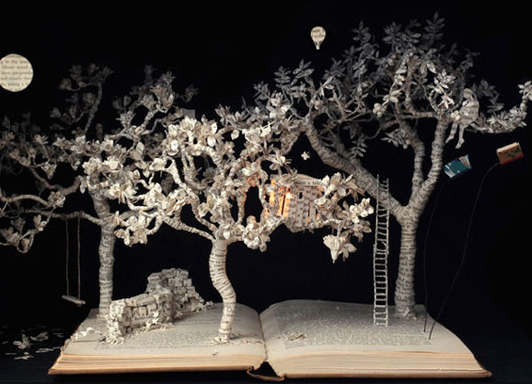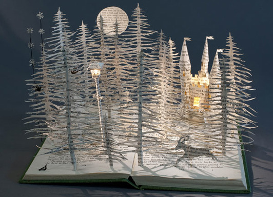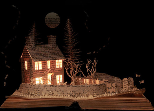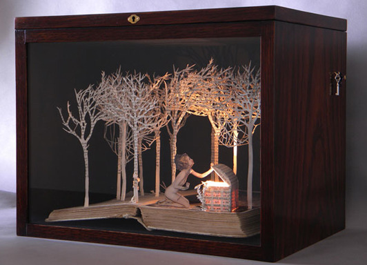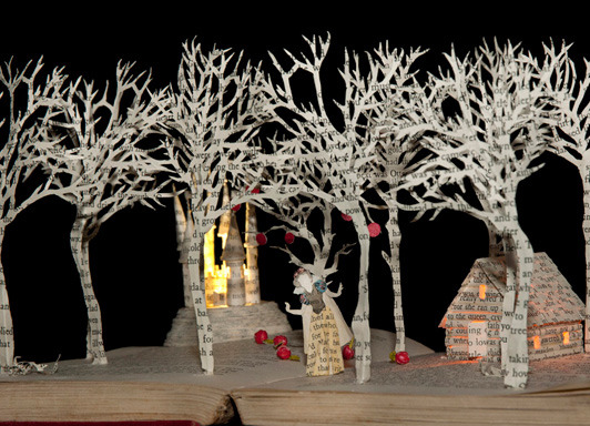 Artist Su Blackwell cuts out images from books to create three-dimensional dioramas.