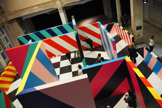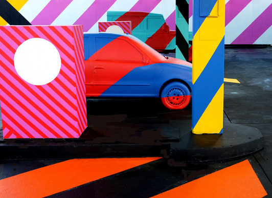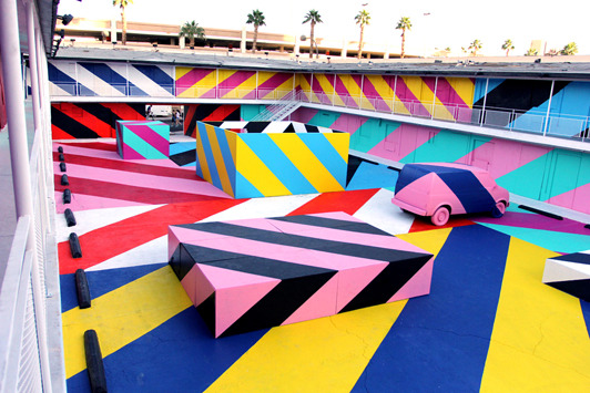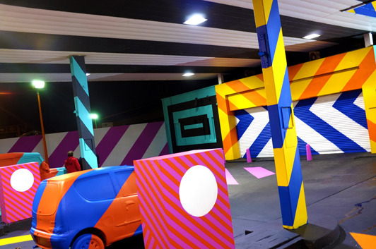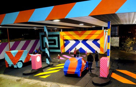 Nº27 – A Nod to Ed Ruscha* is a street installation in Limerick City, by the Irish artist Maser. He converted a derelict petrol station into an interactive installation, as part of a transformative urban art project with some of his distinctly colourful patterns.