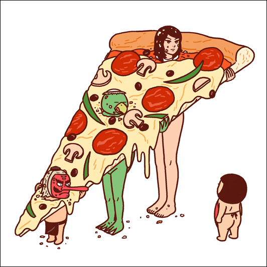 Tokyo based artist/illustrator Kimiaki Yaegashi invites us to have a slice of pizza with him. I am up for it! P Is For Pizza, funny / weird series speaks for itself… Have a byte!