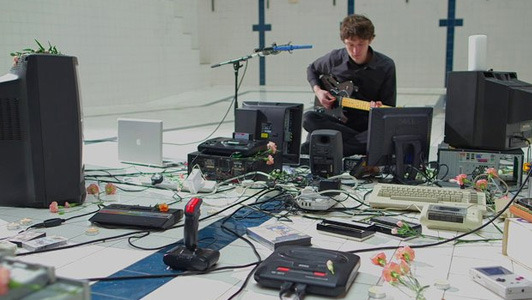 Musician Julian Corrie sits at the bottom of a dry swimming pool, joined by an orchestra of outmoded technology. It's a music video titled Polybius. In place of drums or other instruments, Julian uses a SEGA Mega Drive, a Commodore 64 and several old floppy disk drives to create the accompaniment.