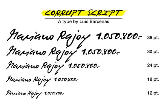 Como me he reído con esta tipografía. Corrupt Script ha sido realizada por el estudio identya inspirándose en la caligrafía de los papeles atribuidos a Luis Bárcenas (extesorero del Partido Popular) que reflejan una supuesta contabilidad B y sobresueldos a destacados miembros del partido.