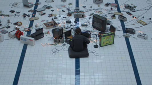 El músico Julian Corrie se sienta en el fondo de una piscina vacía, junto a una orquesta de tecnología obsoleta. El videoclip se llama Polybius. En vez de la batería u otros instrumentos, Julian utiliza una SEGA Mega Drive, un ordenador Commodore 64 y varios lectores de disquetes antiguos para crear el acompañamiento rítmico.
