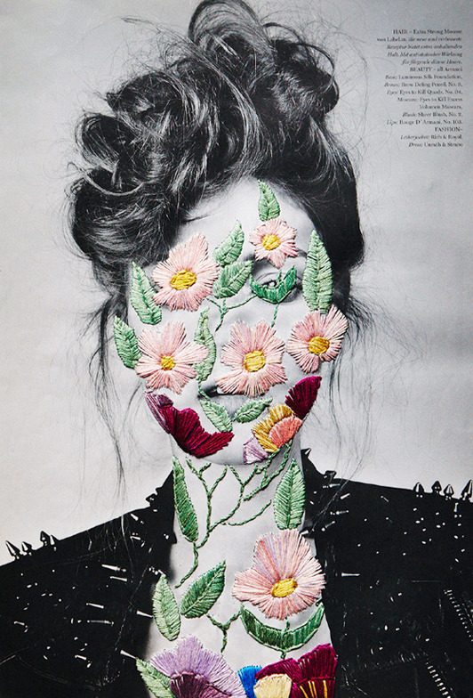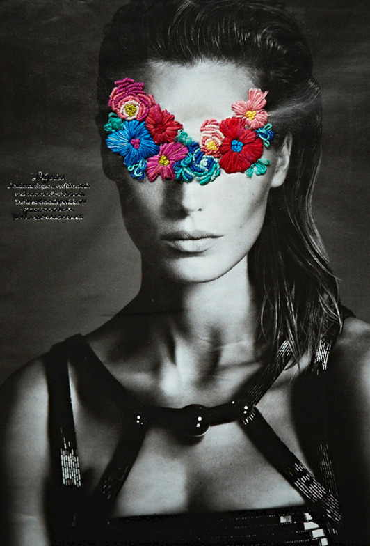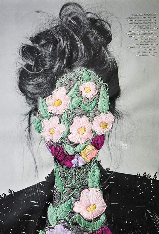 Los trabajos de José Romussi son una forma de intervención artística. Sus obras son creadas bordando viejas fotografías y recortes de revistas. La unión de lo tradicional y lo novedoso, hecho a mano. El proceso implica una capa base – una imagen bidimensional encontrada o fotografiada – revestida con formas geométricas, letras, o animales que sobresalen con hilo colorido.